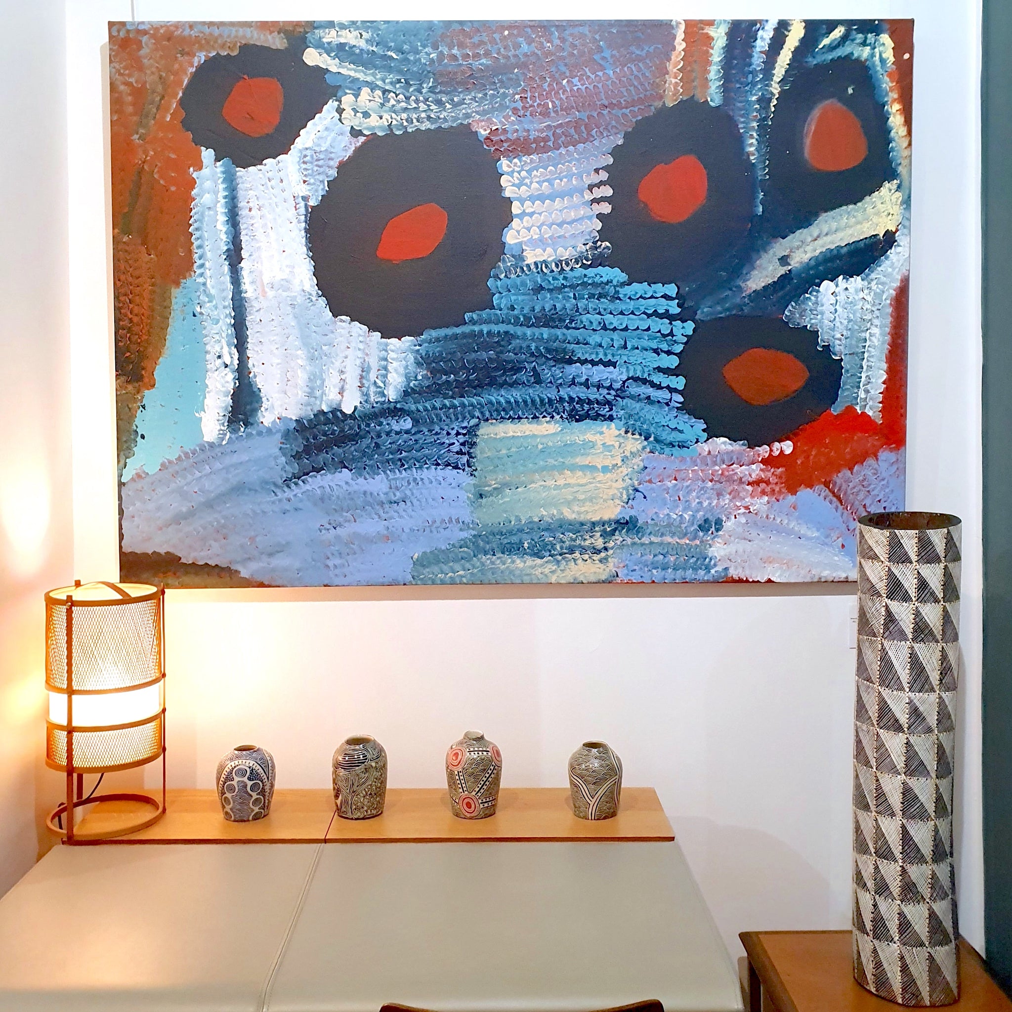 Documentation : L'oeuvre est accompagnée du certificat d'authenticité du centre d'art aborigène officiel dont l'artiste fait partie.