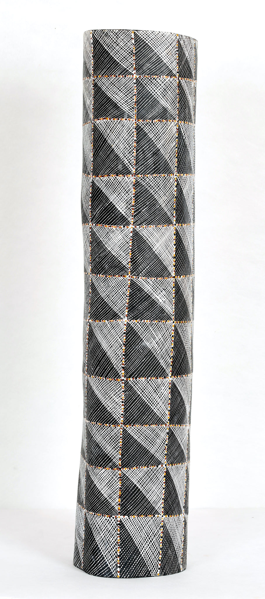 L'artiste a réalisé une sculpture d'un Tronc Funéraire portant des motifs de clan et des marqueurs stylistiques qui lui sont propres.