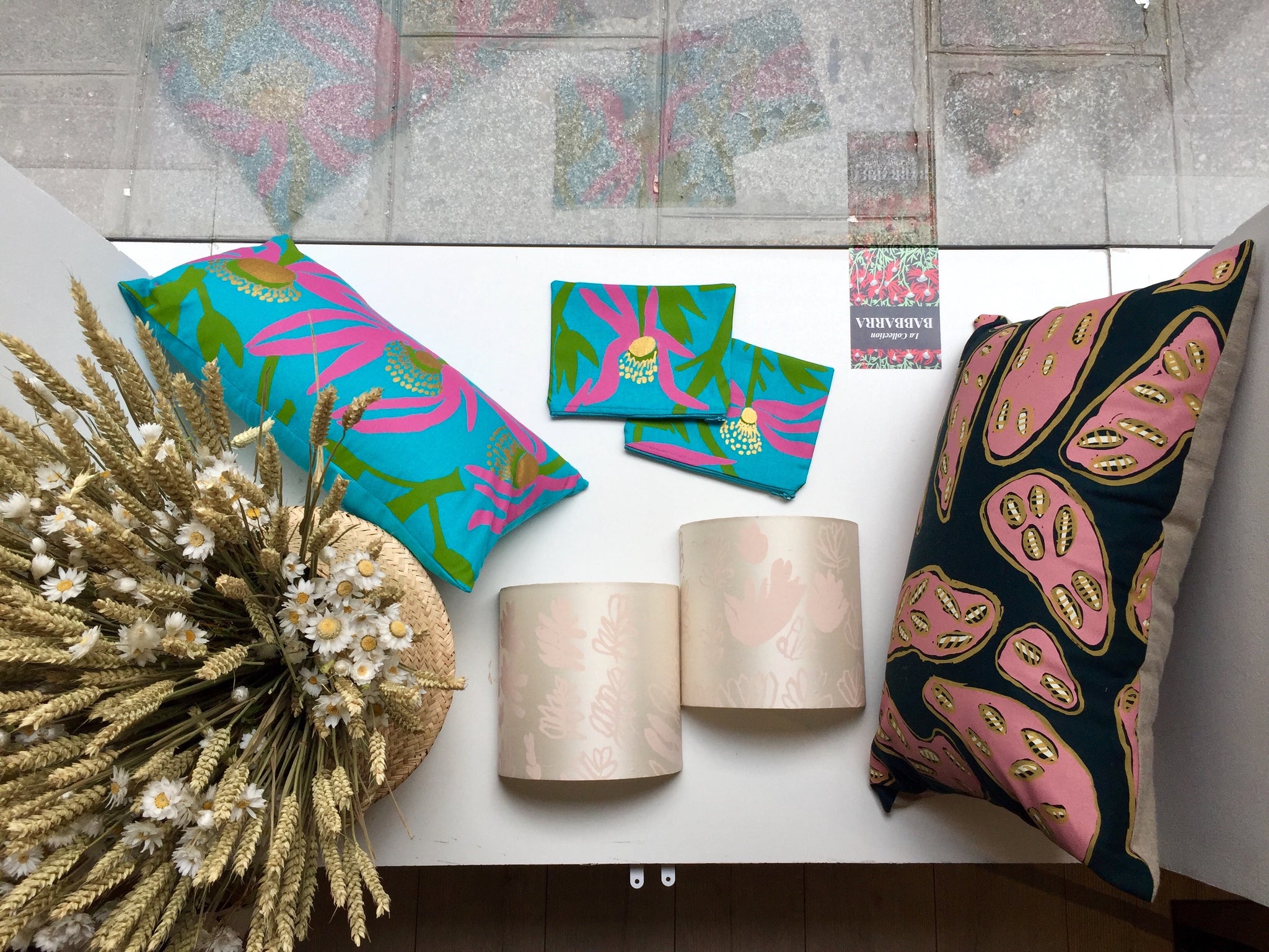 Fabric: Art screen printing on light beige silk, hand-printed with eco-friendly inks by female artists from the Bàbbarra Women's Center in the Aboriginal community of Maningrida in Arnhem Land, Australia .