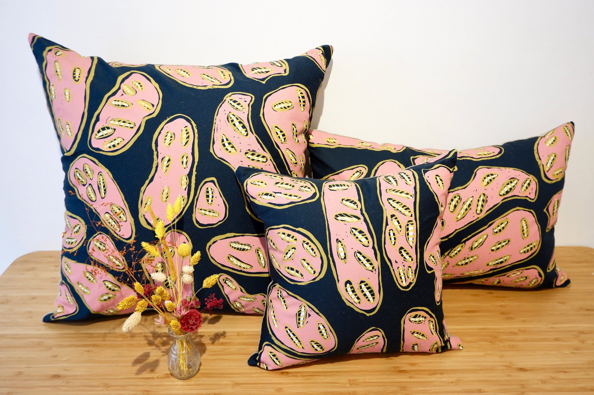 Fabric: Silkscreen fabric art in dark green linen, hand-printed with eco-friendly inks by female artists from the Bàbbarra Women's Center in the Aboriginal community of Maningrida in Arnhem Land.