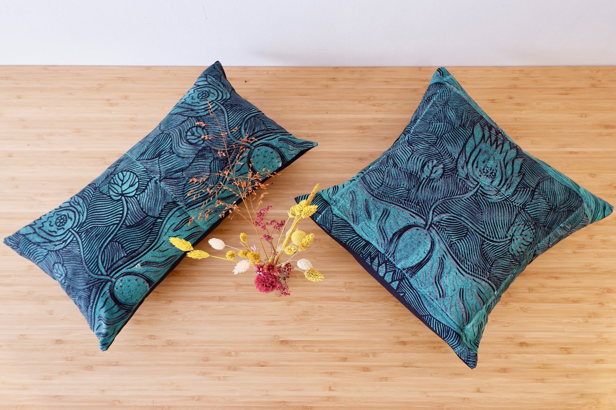 Fabric: Linocut on black cotton fabric, hand printed with eco-friendly inks by the women artists of theBàbbarra Women's Center in the Aboriginal community of Maningrida in Arnhem Land .